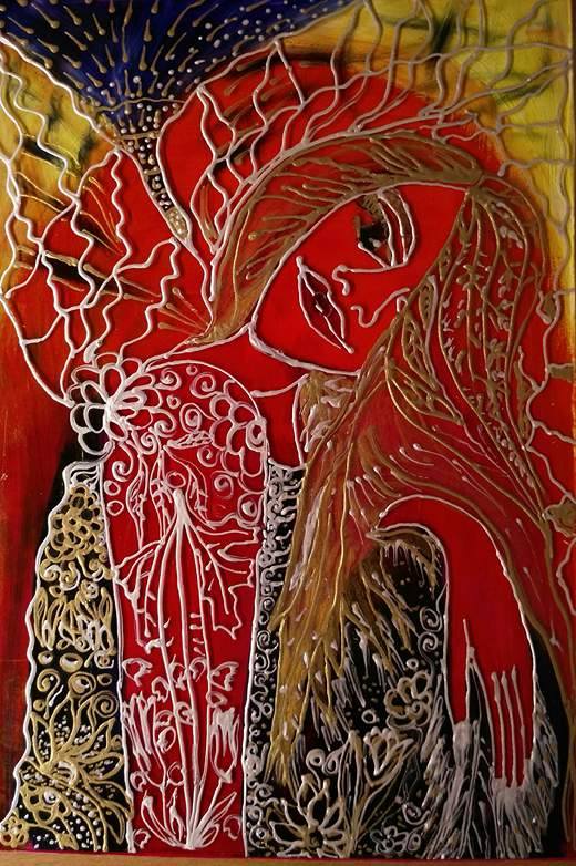 Anjel radosti a pohody na skle maľované v zlatom ráme