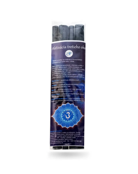 Telové sviečky tretie oko - 6 chakra sú úžasným pomocníkom na prečistenie a harmonizáciu energetických dráh v tele aj v duši. Biele plátno je namáčané v čiernom vosku s prímesou živíc a bylín, výsledkom sú modré, energeticky veľmi silné sviečky ktoré pôsobia relaxačne, podporujú aktiváciu tretieho oka a rozprúdia energiu v tele. Pri použití, vložte do sviečky zámer a priložte na oblasť tretieho oka alebo iné energetické centrum.  Sviečky sú s láskou a ručne vyrobené, priamo na Slovensku. Príjemne aromatické a bez esenciálnych olejov.